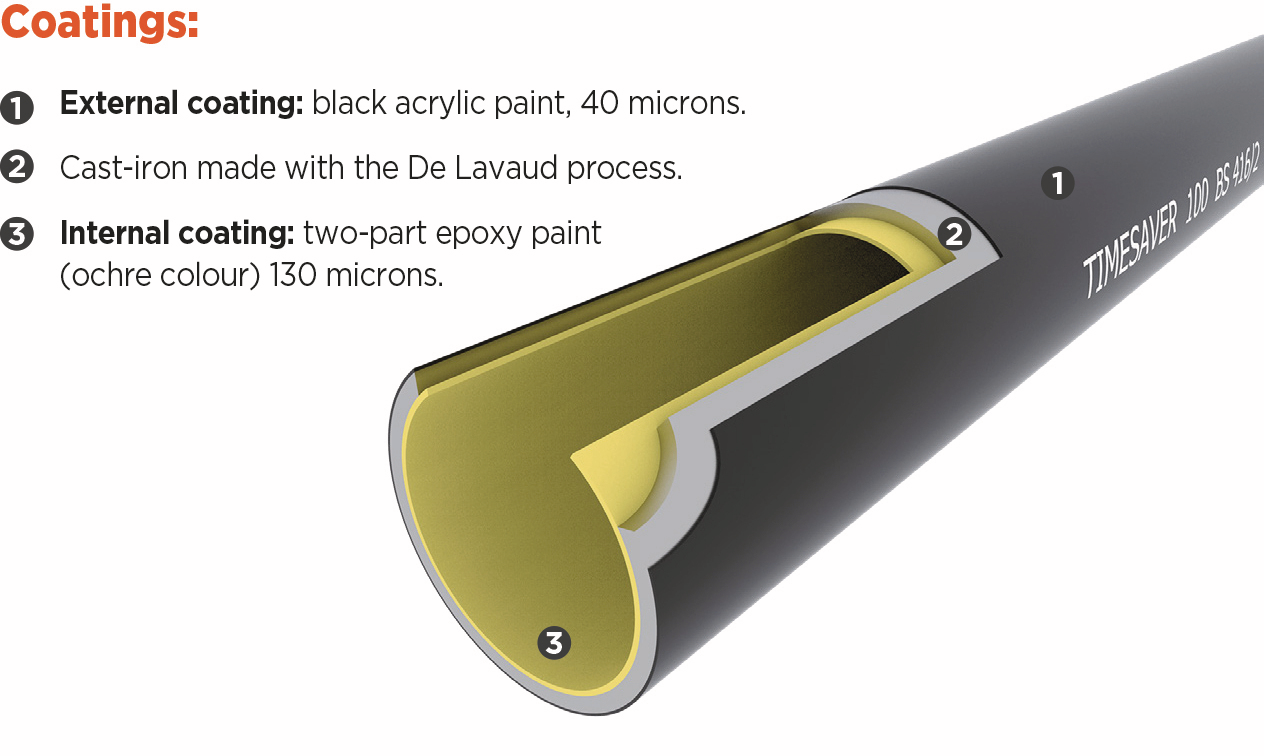 TD00 Timesaver Drain Double Spigot Pipe 150mm x 3M. Timesaver Drain cast iron double spigot pipes, are manufactured using the De Lavaud process. The spun pipes are placed and rotated in a heat treatment furnace at 950° C and then gradually cooled again. This process considerably improves the mechanical properties of the cast iron providing greater crush and impact resistance and makes then easier to cut on site. Used for gravity below ground foul and rainwater applications often installed under commercial, public and residential buildings.