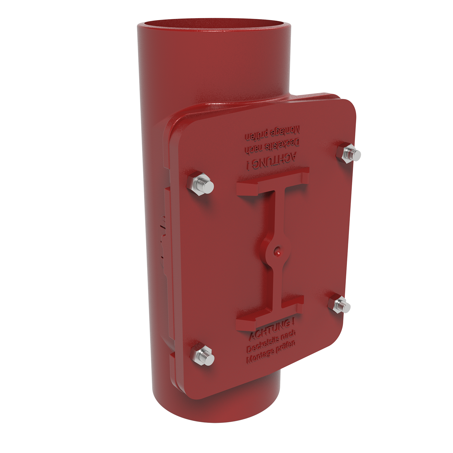 The access pipe with rectangular door has a wider opening and therefore is often used at the base of the stack in basements / car parks to maximise opportunity for cleaning. Easy opening and closing of the cast iron cover using T spanner EF098 or 13mm deep socket.