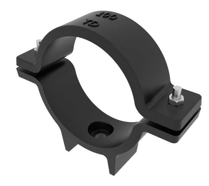 Timesaver Drain two-part bracket for restraining cast iron pipe and fitting components to structural elements using M12 all thread fixing rods.