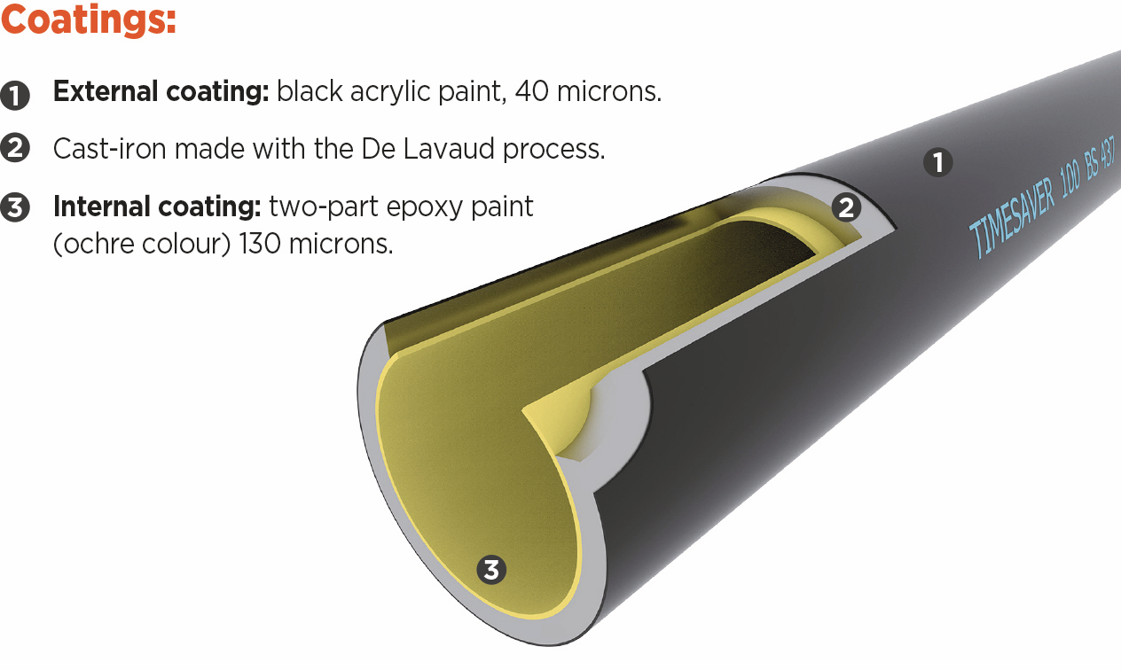 Timesaver soil cast iron double spigot pipes, are manufactured using the De Lavaud process. The spun pipes are placed and rotated in a heat treatment furnace at 950° C and then gradually cooled again. This process considerably improves the mechanical properties of the cast iron providing greater crush and impact resistance and makes then easier to cut on site. Used for gravity above ground foul, vent and rainwater applications for commercial, public and residential buildings.