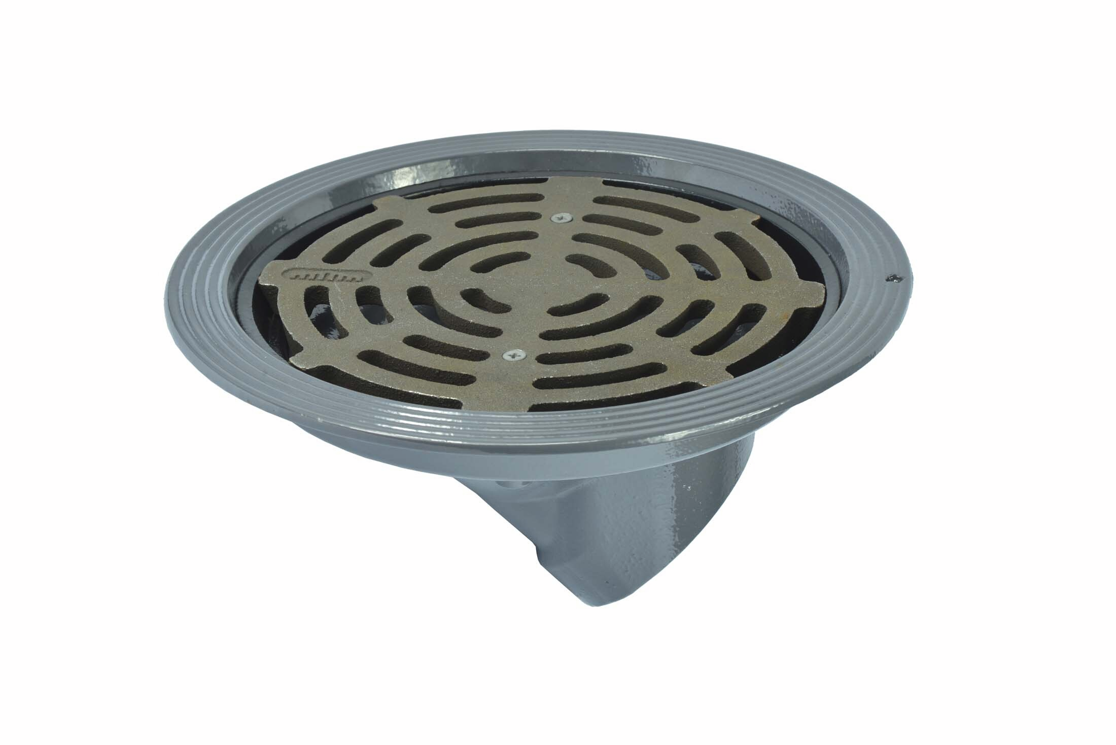 VX-R255 VortX Roof Outlet Angled with Dome Grating 4" BSP x 88°. The VortX cast iron vertical roof drain body has a unique flange design with 4 identification rings that provides a key for the waterproofing membrane or final floor finish, and has dimples to assist drilling location for fixing to the structural deck.