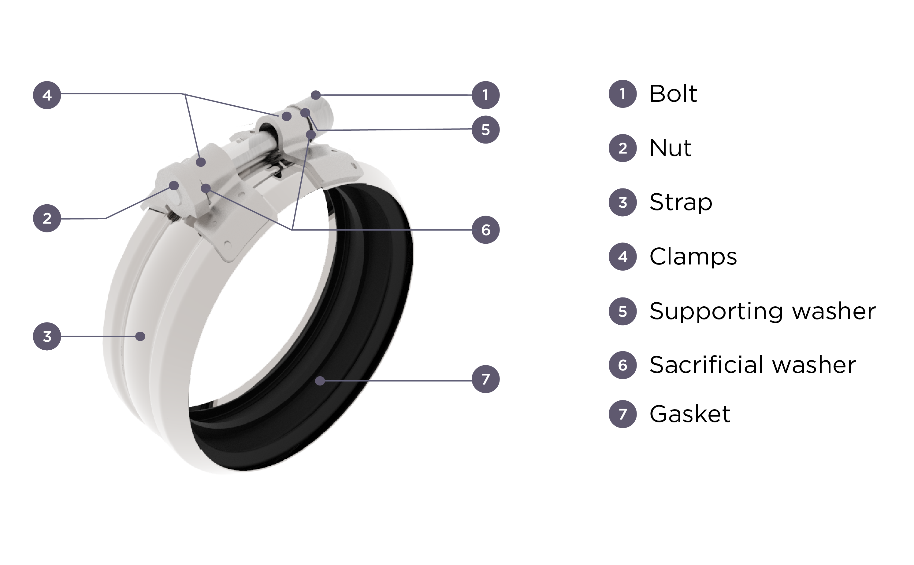Ensign soil stainless steel single piece, single bolt Rapid NG coupling assembled utilising a captive socket cap screw driven by a 6mm allen key and includes an EPDM gasket as standard. The cap screw is completely tightened leaving no gap and assembled in seconds.